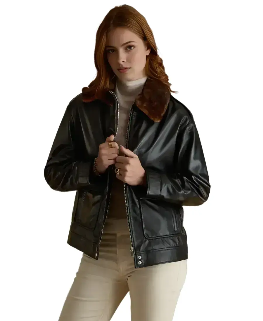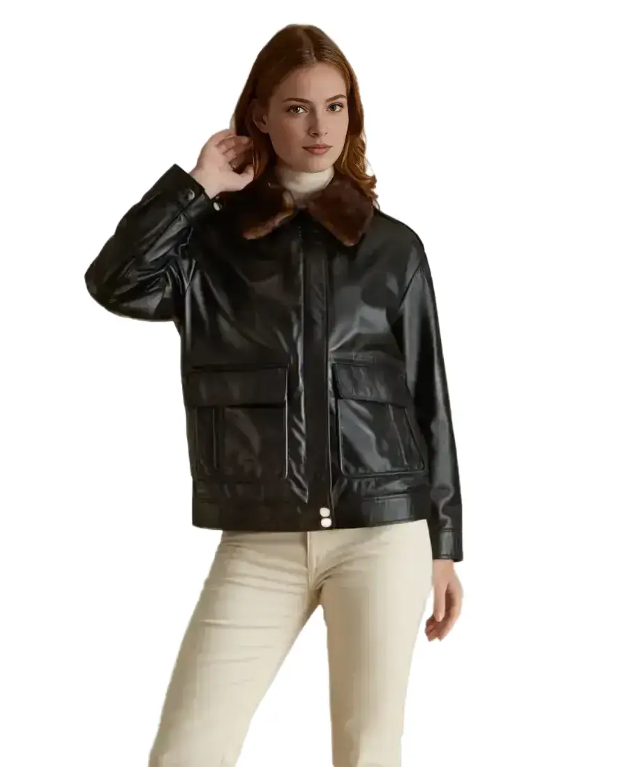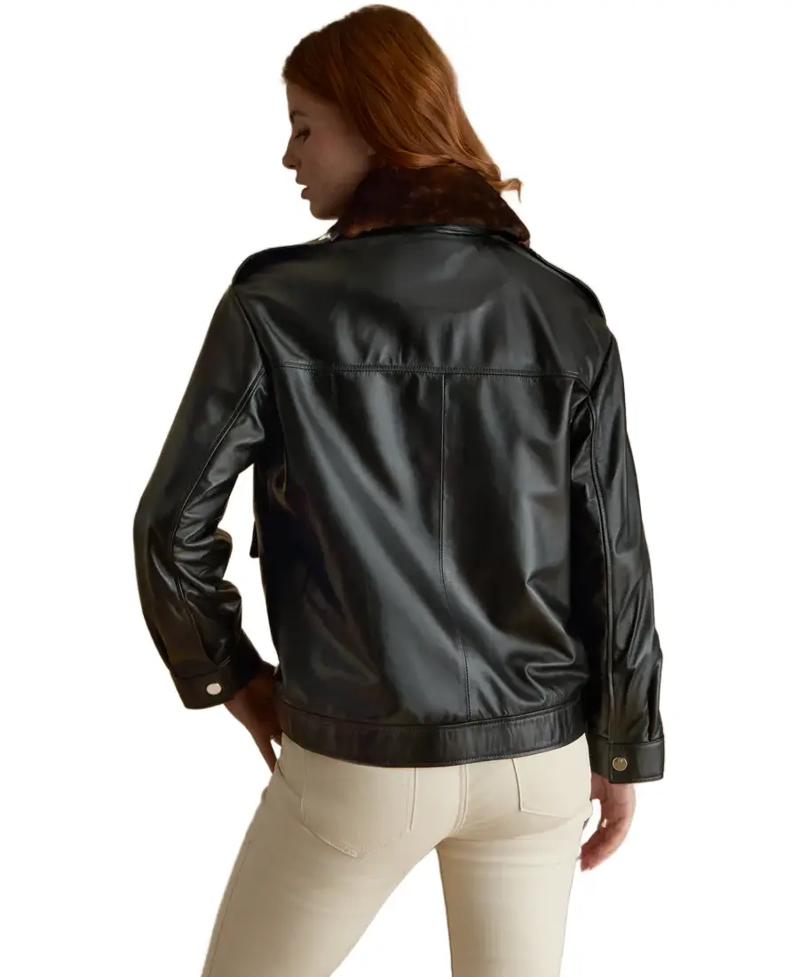 Women Black Shearling Collar Leather Jacket
