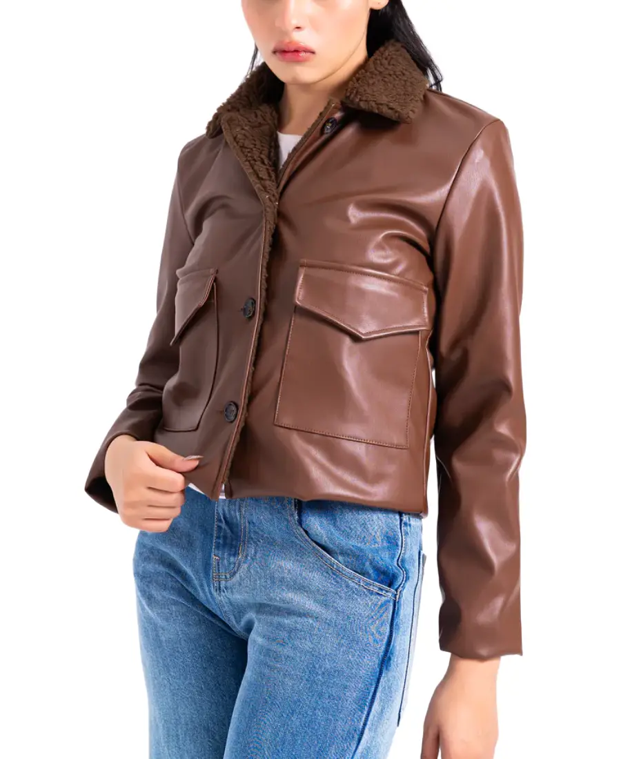 The Women Brown Sherpa Collared Leather Jacket blends warmth with a refined everyday look. Made from vegan leather it offers a sturdy outer layer with a soft hand feel that works well for cooler days. The sherpa collar adds a cozy touch around the neckline and gives the jacket a winter ready character. A front zipper closure keeps the fit secure and easy to adjust depending on how you choose to style it. Full length sleeves with open hem cuffs provide natural movement and a relaxed finish at the wrists. The viscose lining creates a gentle layer against the skin making it comfortable for long hours of wear. Two flap pockets on the front offer practical space for small essentials while enhancing the overall design. The brown shade brings warmth and depth making this jacket a reliable option for pairing with denim boots and layered seasonal outfits.