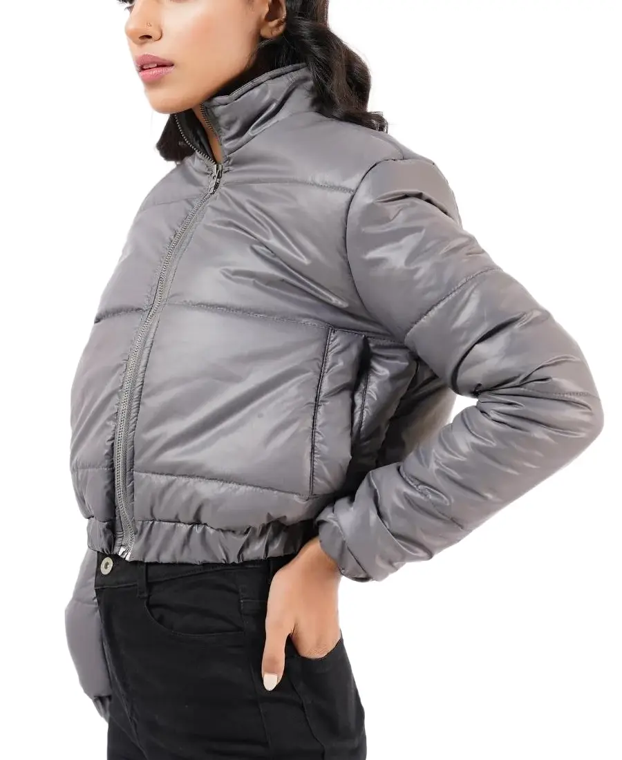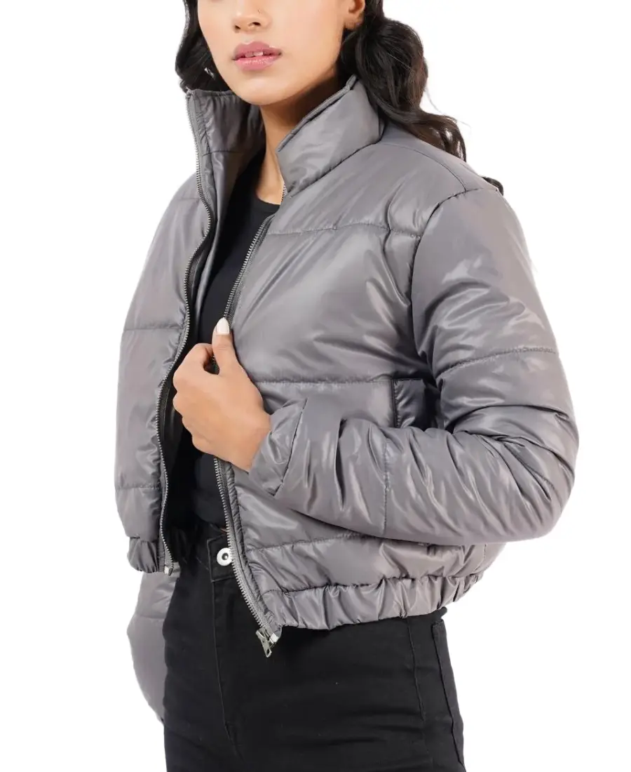 The Women Grey Cropped Puffer Jacket is designed for a modern street inspired look that balances warmth with a flattering shape. Made from parachute fabric it feels lightweight yet durable making it ideal for cooler days. The cropped length adds a trendy touch that pairs well with high waist jeans or fitted bottoms. A stand up collar frames the neckline and helps shield against chilly air while the front zipper closure keeps the jacket secure. Full length sleeves are finished with zipped cuffs allowing slight adjustment and adding a subtle detail. The viscose lining provides a soft layer inside making it comfortable for extended wear. Two side pockets offer practical space for keeping hands warm or carrying small essentials. The grey color gives it a neutral and easy going tone that works well with both casual and sporty outfits.