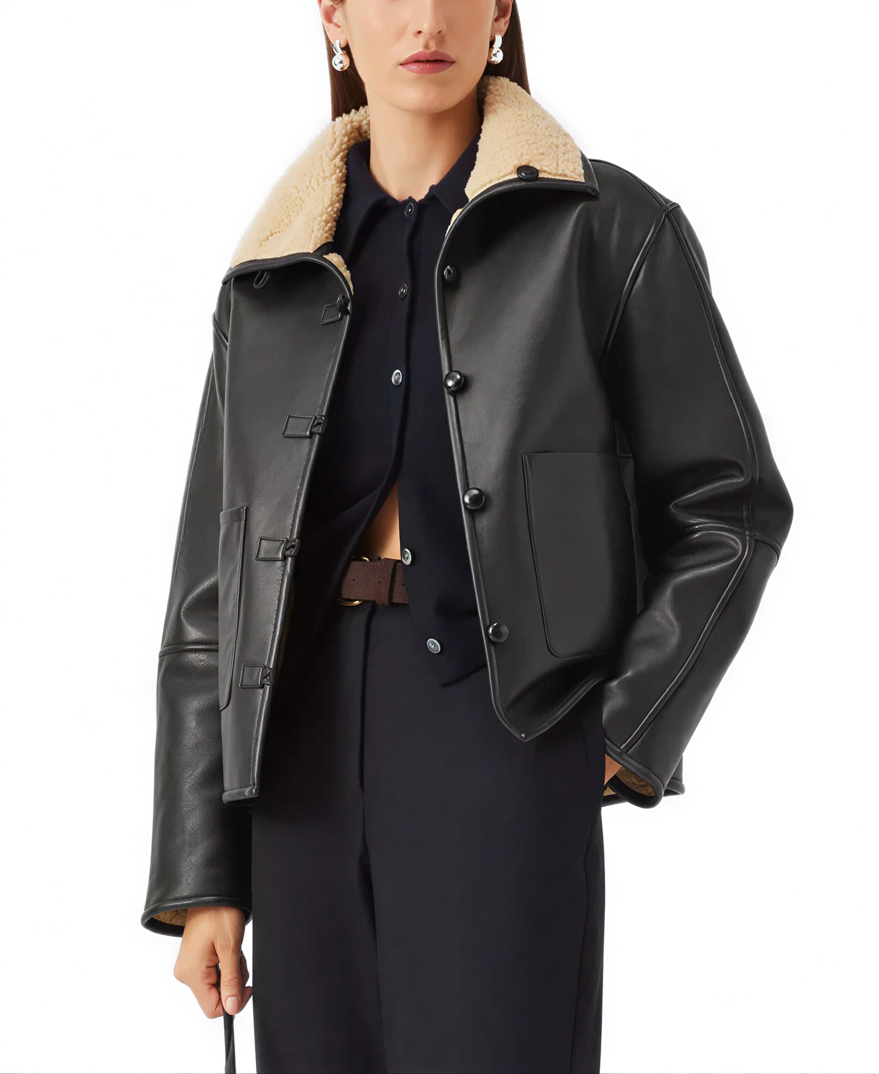 The Women’s Black Sherpa Collar Leather Jacket is a great pick for daily wear with a clean and simple look that fits into many outfits this jacket is made from faux leather which gives a strong outer layer that holds its shape well while the inner viscose lining makes it easy to wear for long hours the sherpa detail collar adds a warm touch around the neck and brings a bit of texture that stands out in a natural way the open hem cuffs keep the sleeves relaxed and give the jacket a laid back feel the front button closure adds a classic touch and makes it easy to put on without any hassle full length sleeves provide proper coverage which makes it suitable for cooler days the jacket includes two waist pockets which are useful for keeping small items close or for resting your hands the black color gives a neat and sharp look that pairs well with jeans or trousers without much effort this jacket belongs to the Leather Jackets category which is known for its everyday style and practical use making it a good choice for anyone who wants a simple yet reliable outer layer for regular wear.