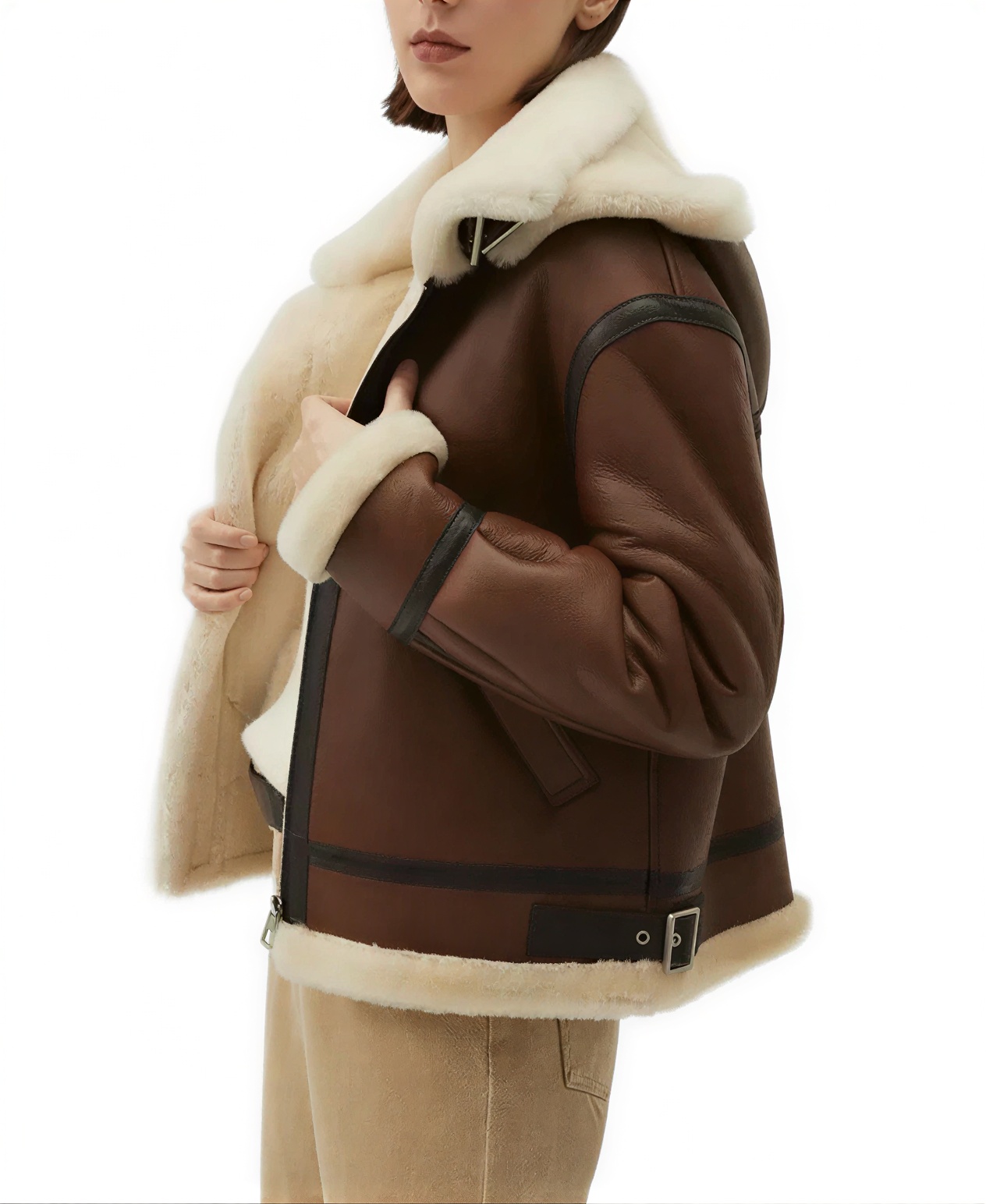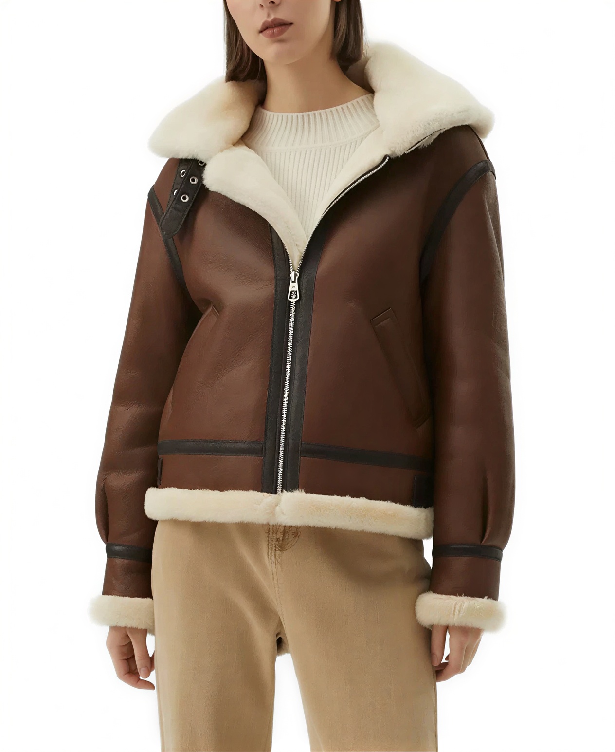The Women’s Brown Sheepskin Aviator Leather Jacket brings a rich winter look that feels right for daily wear while holding a strong aviator identity this jacket is made from sheepskin leather which gives a firm and lasting outer layer and the inner fur lining adds warmth for colder days the fur collar covers the neck area well and adds a classic touch that stands out in a simple way the open hem cuffs allow the sleeves to sit naturally and keep the overall design relaxed the front zipped closure makes it quick to wear and keeps everything in place when you are outside full length sleeves provide full coverage which helps during chilly weather the jacket includes two side pockets for daily use along with one inner pocket to keep small items safe the brown color gives a natural tone that pairs well with denim or dark outfits making it easy to style without much effort this piece fits into the Aviator Jackets category which is known for its strong look and practical use making it a good option for anyone who wants a reliable jacket that carries a classic feel with everyday function.