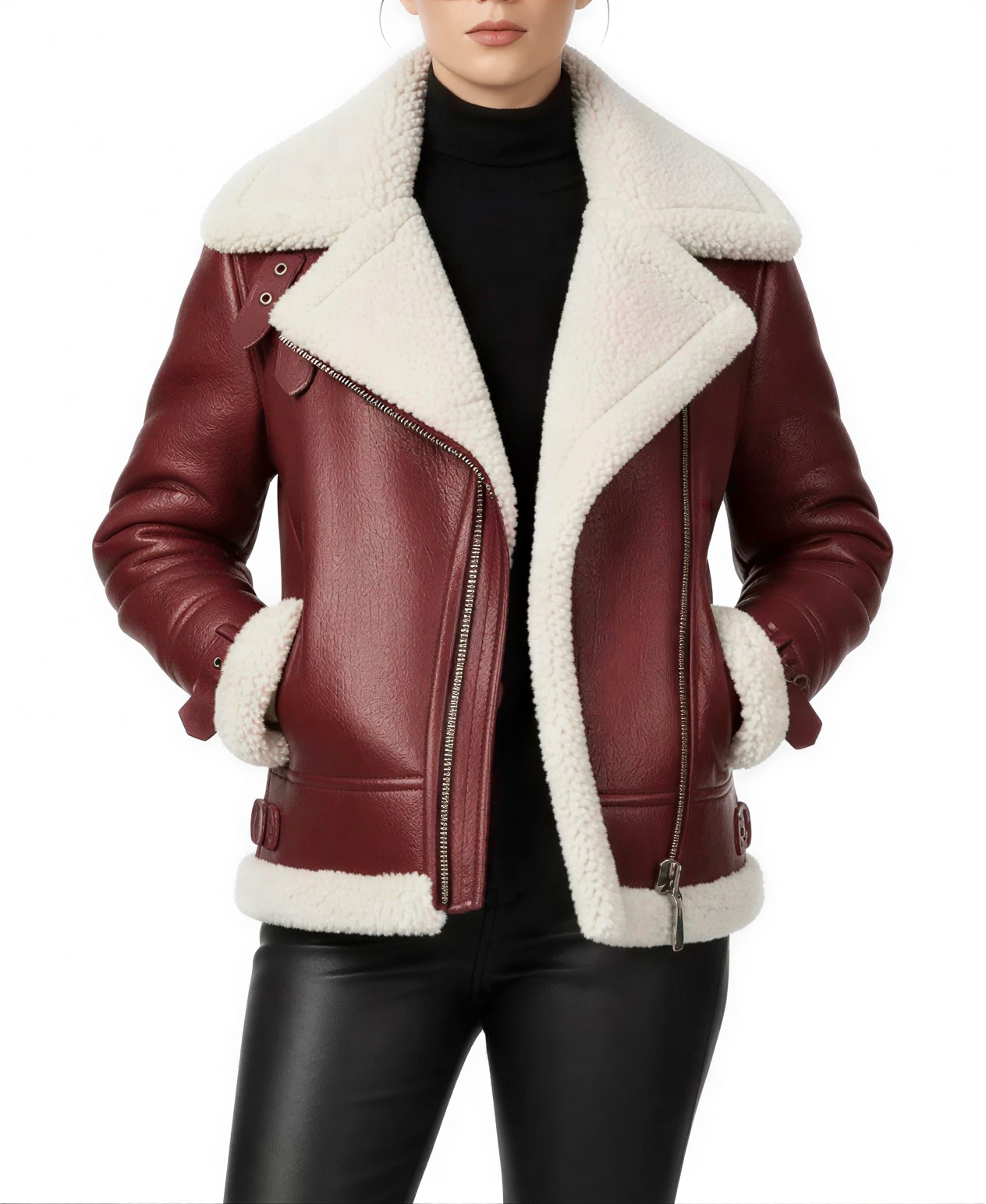 The Women’s Burgundy Leather Shearling Jacket brings a rich and eye catching look that fits well into everyday wear while offering good warmth for colder days this jacket is made from faux leather which gives a durable outer layer that holds its shape while the inner faux fur lining adds a warm feel that makes it suitable for winter use the lapel style belted collar gives extra coverage around the neck and adds a stylish detail that makes the jacket stand out in a simple way the open hem cuffs allow the sleeves to fall naturally and keep the overall design relaxed the front zipped closure makes it easy to wear and keeps everything secure when you are outside full length sleeves provide proper coverage which helps during chilly weather the jacket comes with two side pockets for daily use along with one inner pocket to keep small items safe the burgundy color gives a deep and rich tone that pairs well with both light and dark outfits this jacket fits into the Fur & Shearling Jackets category which is known for its warm feel and practical use making it a great option for anyone who wants a jacket that adds color to their wardrobe while still being reliable for regular use.