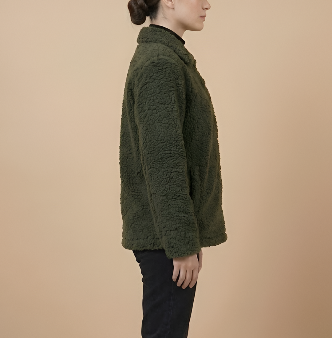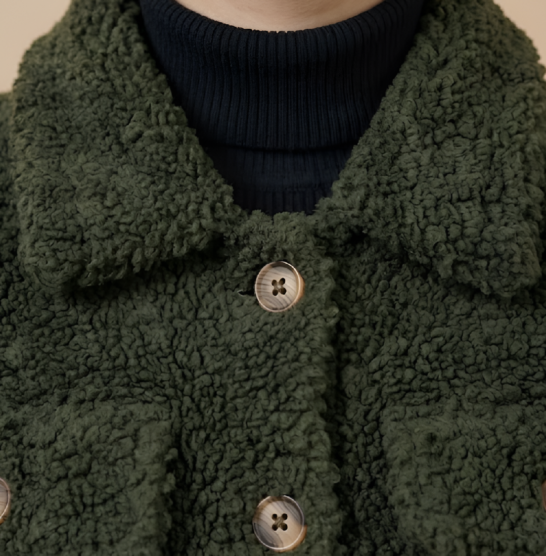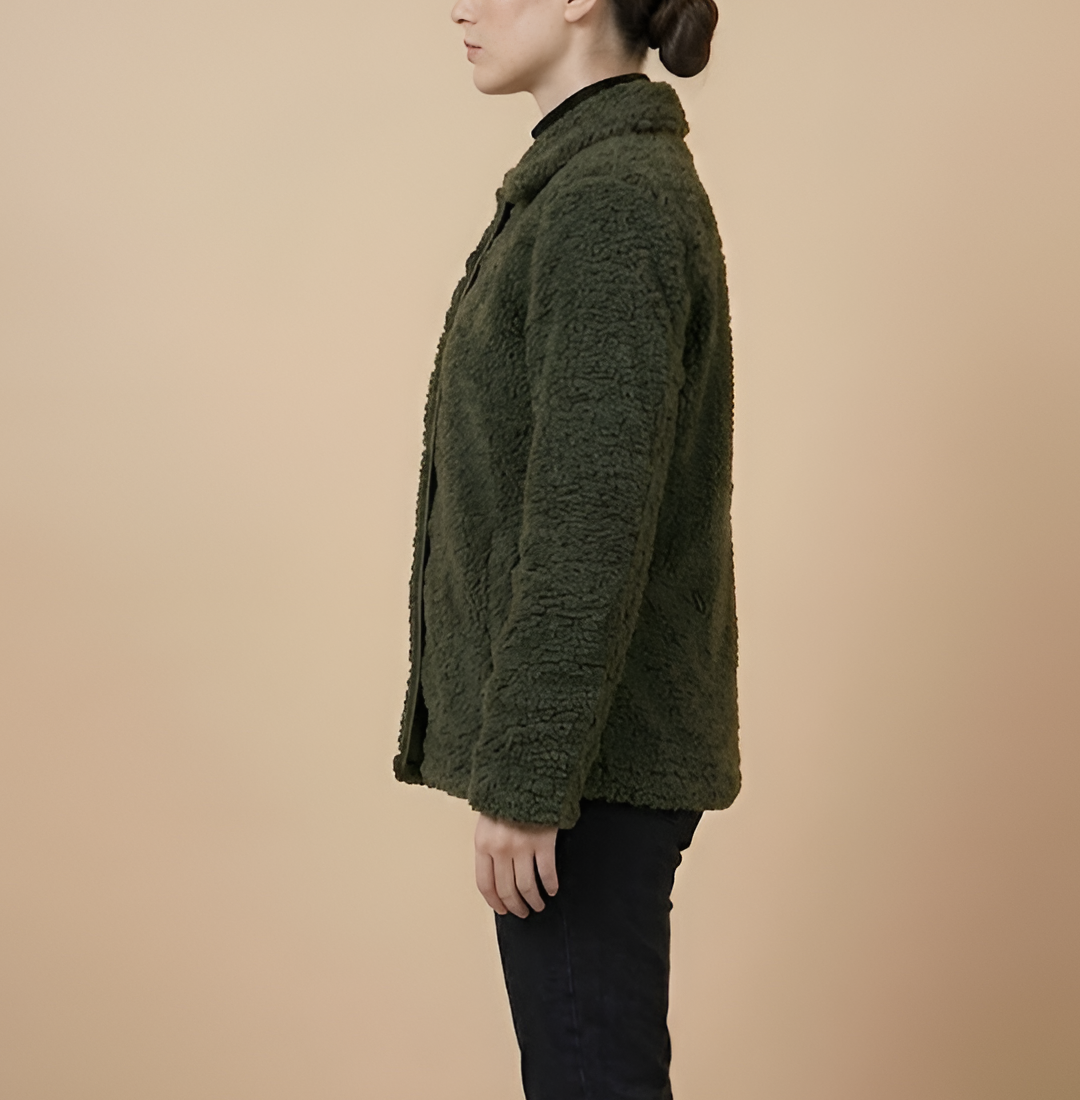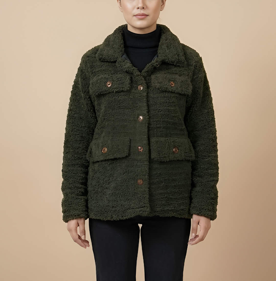 Beyond its stylish appearance, this jacket is crafted for ultimate warmth and long-lasting durability. The high-quality faux Sherpa material offers excellent insulation against the winter chill, while the smooth viscose lining on the inside ensures a soft and comfortable feel against your skin. This jacket features a classic shirt-style collar and a reliable button closure for a timeless and functional design. With four spacious flap pockets on the front, you have more than enough room to keep your essentials secure and within reach. Finished with full-length sleeves and open hem cuffs for a relaxed fit, this olive jacket is a reliable and fashionable investment that you will enjoy wearing season after season.